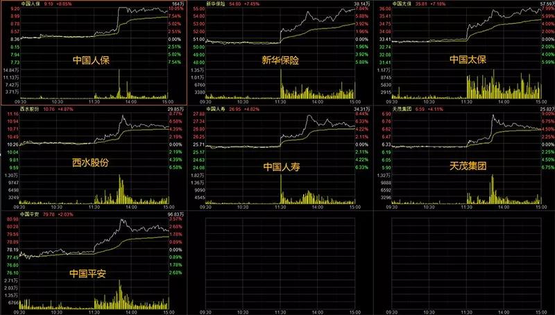 A股市场闻风而动。受此消息刺激,保险股今天午后急速拉升,中国人保盘中涨停。其余四巨头中国人寿、中国平安、中国太保、新华保险分别上涨4.82%、2.03%、7.18%、7.45%;两只保险“影子股”——天茂集团、西水股份的涨幅也分别达到4.11%、4.87%。