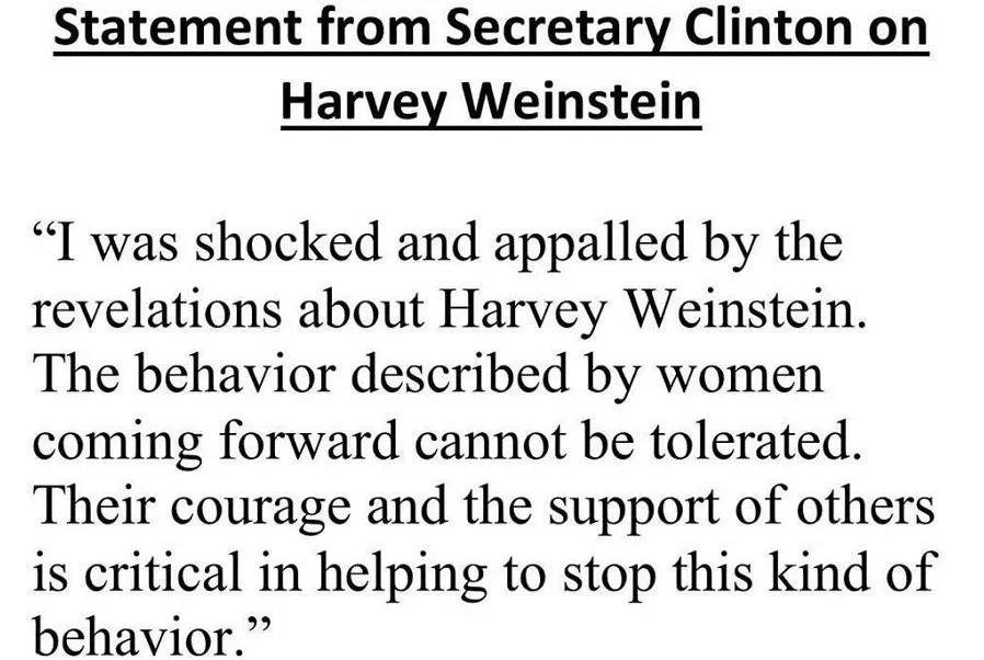 前美国总统民主党参选人希拉里·克林顿则分享了一份声明说,她对关于韦恩斯坦的消息曝光感到“震惊和惊骇”。希拉里在2016年参选总统时,韦恩斯坦曾向她的阵营捐款,也是希拉里和奥巴马所属的民主党重要的捐款者之一。