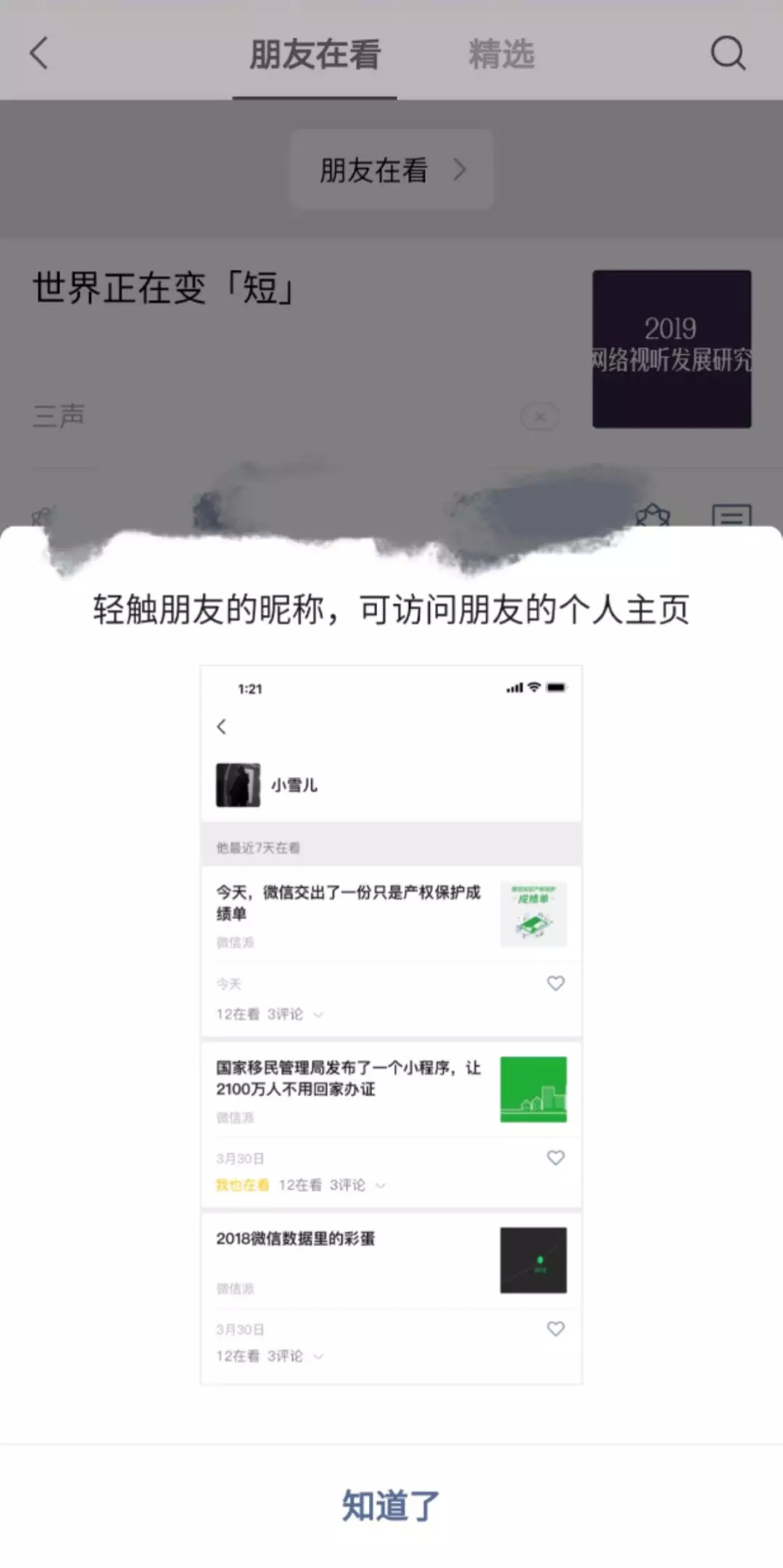 据《新商业情报NBT》体验发现,灰度测试覆盖的用户进入微信“看一看”后,会收到微信的功能提醒:“轻触朋友的昵称,可访问朋友的个人主页”。