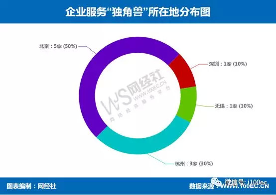 据网经社泛电商“独角兽”数据库显示,2018年企业服务“独角兽”出现高度集中,其中北京(5家,占比50%)、杭州(3家,占比30%)、无锡(1家,占比10%)、深圳(1家,占比10%)。