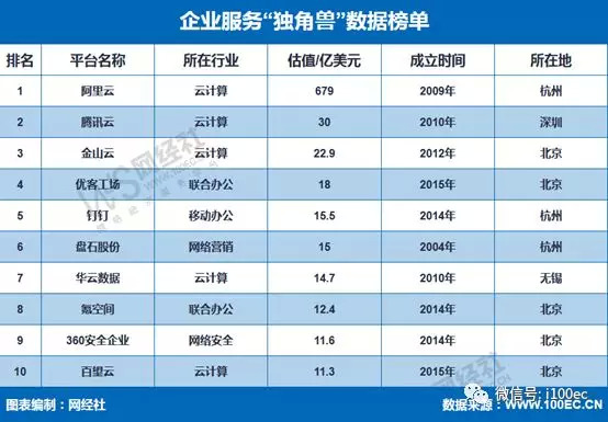 2018年企业服务“独角兽”分别为:阿里云(679亿美元)、腾讯云(30亿美元)、金山云(22.9亿美元)、优客工场(18亿美元)、钉钉(15.5亿美元)、盘石股份(15亿美元)、华云数据(14.7亿美元)、氪空间(12.4亿美元)、360安全企业(11.6亿美元)、百望云(11.3亿美元)。其中,云计算5家、联合办公2家、移动办公1家、网络营销1家、网络安全1家。