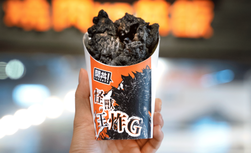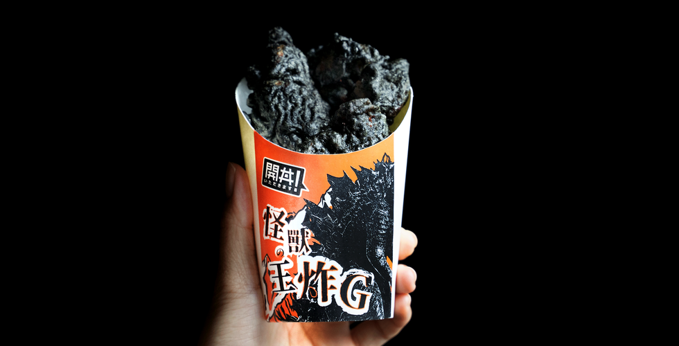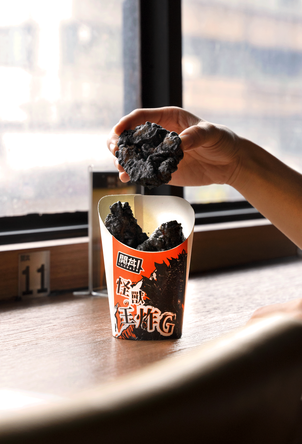最近,台湾地区的開丼門市就推出了一款“怪兽炸鸡排”。这款炸鸡排在造型上可以说十分应景,厚厚竹炭面糊包裹着的鸡块呈现出厚实的黝黑景象,既是哥斯拉的黑色崎岖表皮,也是被摧毁后废墟一片的城市。