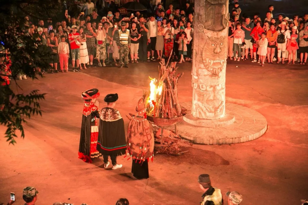 每晚的 8 点 40 分,夜幕铺展,华灯初上。在云南省楚雄市彝人古镇的广场上,熊熊燃烧的火焰与载歌载舞的人群已准备上演今夜的“祭火大典”仪式。在这一仪式上,彝族毕摩将以钻木起火的古老方式来取火种,并点燃第一把火把。这第一把火把被转让给游客,由该游客与毕摩一同点燃这一晚用于祭火的火盆。