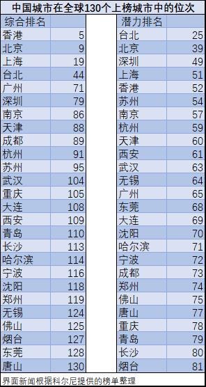 科尔尼在全球范围挑选了130个城市,分别形成两个榜单——“全球城市综合排名”和“全球城市潜力排名”。其中,中国城市在综合排名上的平均得分增长速度是北美城市的3倍,在潜力榜的得分增长速度是欧洲城市的3.4倍。