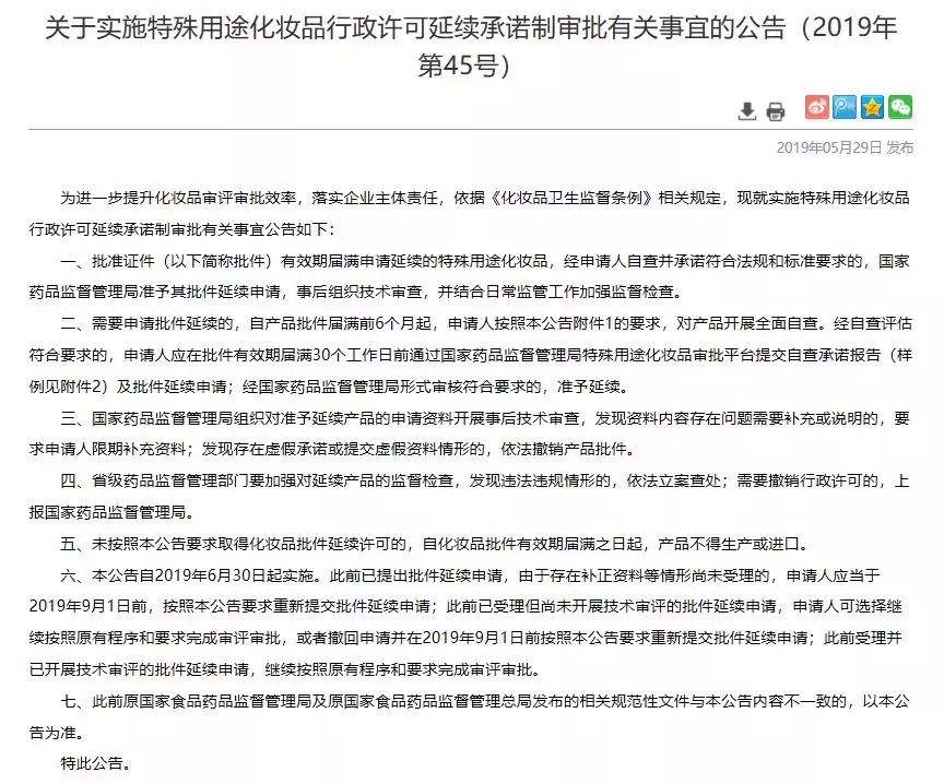 5月29日,国家药品监督管理局发布《关于实施特殊用途化妆品行政许可延续承诺制审批有关事宜的公告》(以下简称《公告》),被视为简化化妆品行政许可批件有效期延续程序,提升审批监管效率,重拳打击市场特证违规现象的一大利好举措。
