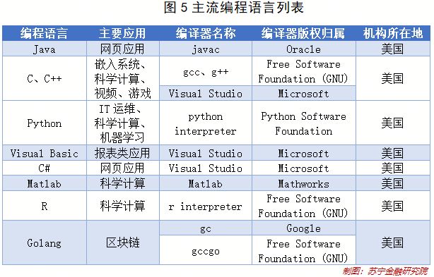 在这些编程语言当中,有很多已成为国际标准。需要指出的是,虽然语言本身已成为国际标准,但其具体实现(专业术语叫编译器)还是有版权的。以下表格汇总了上述编程语言的主要应用场景、主流编译器、以及版权归属情况。从中可以看到,这些语言的主流编译器的版权均为美国公司或美国非盈利机构所有。