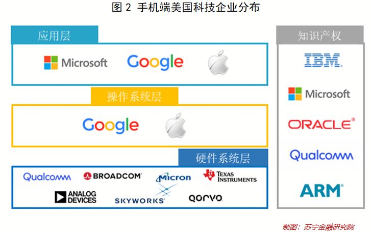 手机端技术可粗略归纳为3个不同层次,它们是应用层、操作系统层和硬件系统层,其中,应用层和操作系统层是软件。贯穿这3层的还有知识产权类产品,它以专利授权的形式体现,很多情况下都不涉及具体软件和硬件实体。下面,我们具体来看一下手机端有哪些有实力的美国科技公司,以及他们所在的技术层。