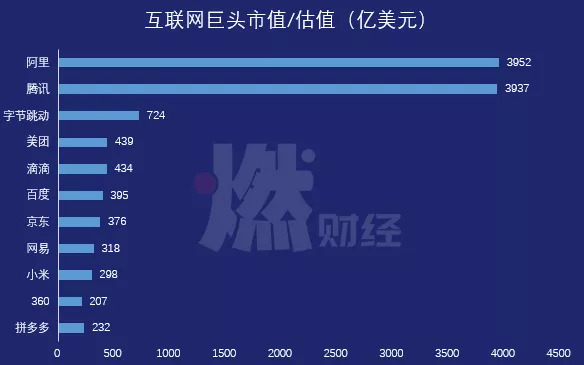 互联网巨头市值/估值(亿美元) 制图 / 燃财经,估值参照《2019一季度胡润大中华区独角兽指数》,市值截止至2019年5月30日20时
