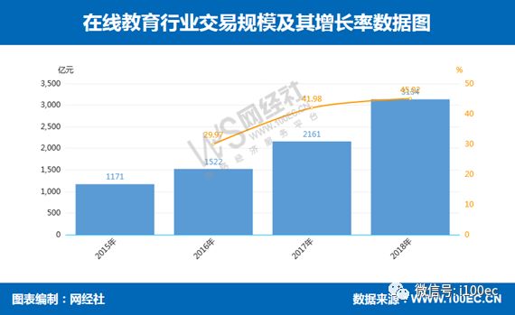 《报告》显示,2018年中国在线教育市场规模约为3134亿元,同比2017年2161亿元增加了45.02%。预计2019年突破4000亿元。