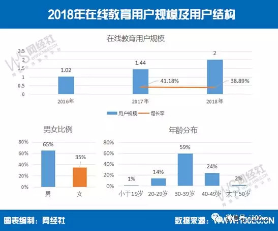 而在用户规模方面,在线教育用户规模快速发展,从2017年1.44亿人增长至2018年的2亿人。在用户关注度方面,2018年在线教育关注群体主要集中在20-49岁人群,其中30-39岁人群比例最高。而这一年龄阶段人群恰是为人父母,孩子接受教育的黄金时段。