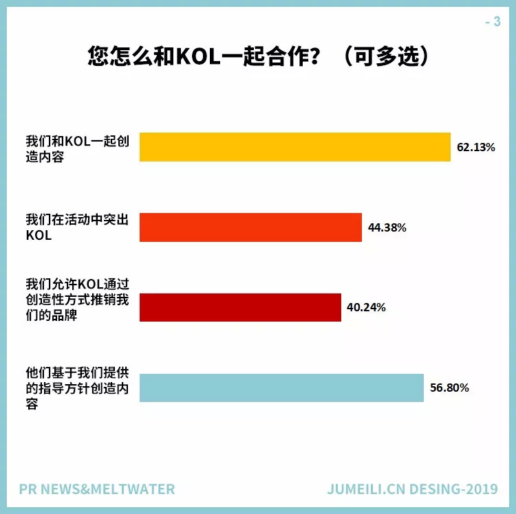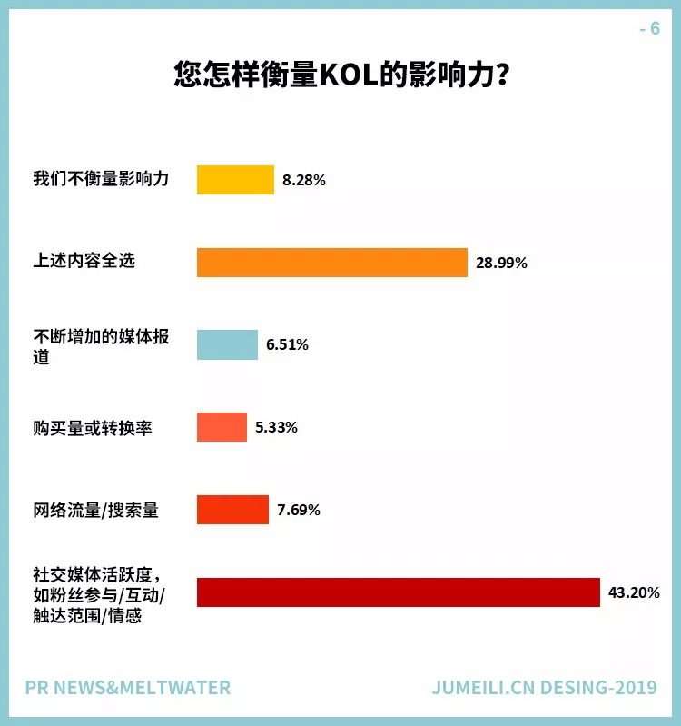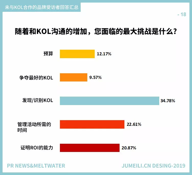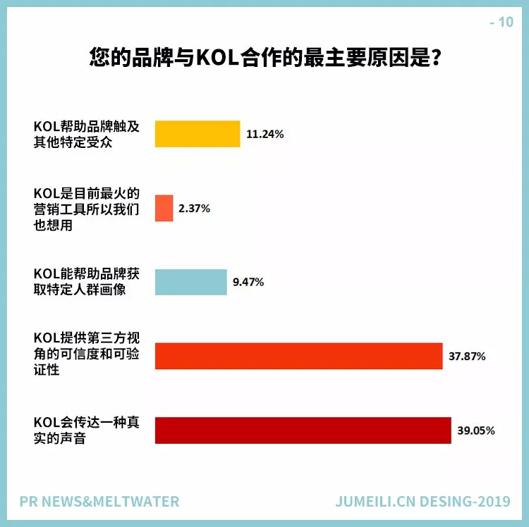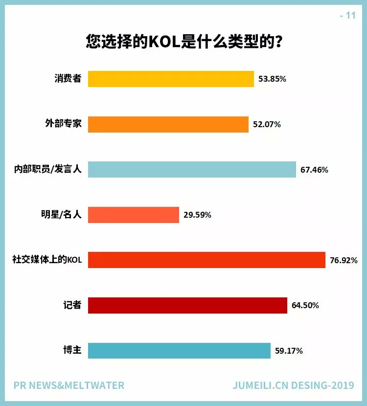 不过更确定的是,KOL在日益重要的内容营销中地位逐渐显现,特别是他们在社交媒体上创建和发布内容的能力巩固了重要性。这一点在PR News(为公关、媒体和有线部门提供战略、分析、建议、研究和成功案例)和软件服务(SaaS)公司Meltwater(开发和销售媒体监控和商业智能软件)进行的一项新调查中得到了证实,在2018年的第四季度,他们收到了近400份来自美国公关专业人士的报告回复。