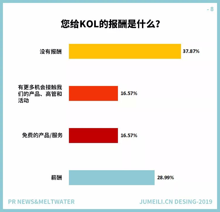 如图8所示,29%的受访者给KOL支付薪酬,38%的人不给任何报酬。其余的受访者要么提供免费的产品/服务,要么提供接触产品和高管的渠道。