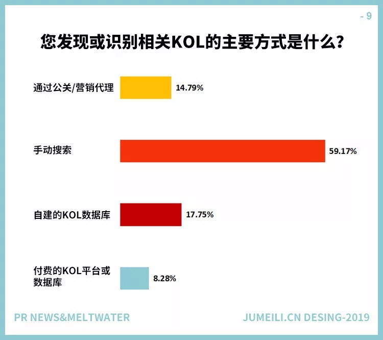 当被问及如何找到KOL时,大多数受访者说“手动搜索”(59%),远远超过了内部数据库(18%)和外部公关代理(15%)。