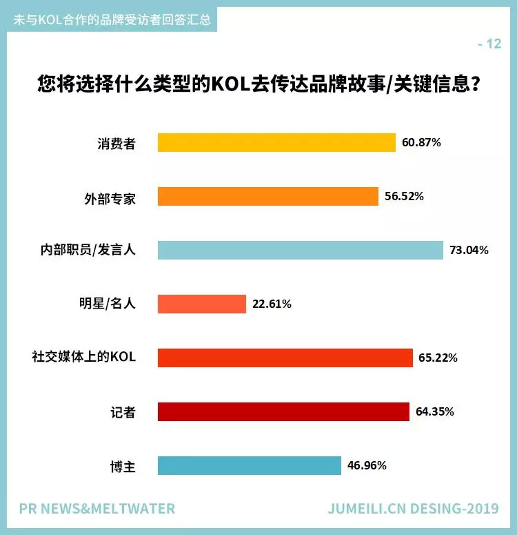 该报告还调查了与品牌、企业合作的KOL的类型。如图11所示,受访者认为博主、记者、社交媒体上的KOL、外部专家甚至客户都是有用的KOL。