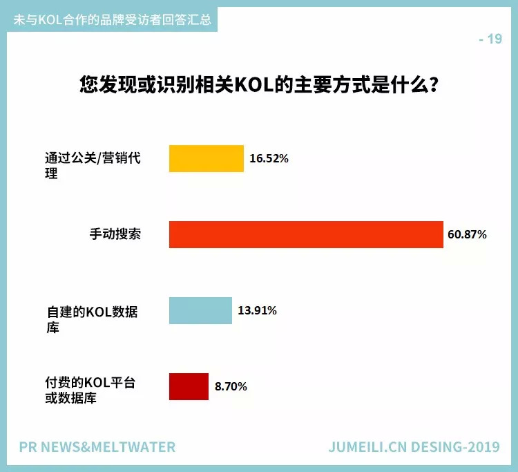 图19和图9具有一致性,当被问及如何找到KOL时,大多数受访者通过“手动搜索”(60%)的方式,这个比例远远超过了内部数据库(13%)和外部公关代理(16%)这两种方式。