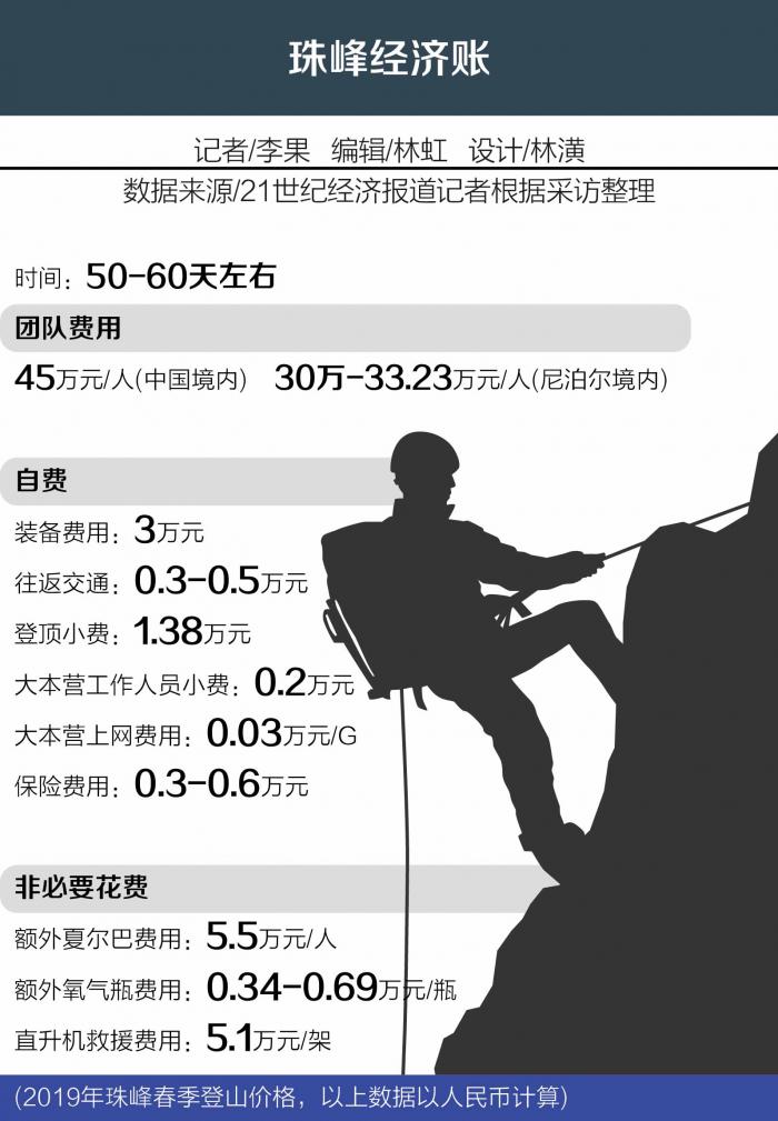 在攀登前期,主要是个人的装备费用,以及国内往返尼泊尔的交通食宿费,个人保险通常不包含在其中,“前后约两个月的时间,个人的保险费用约在3000-6000元人民币”,韩啸表示。
