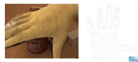 这个神奇手套名为“可伸缩触觉手套”(scalable tactile glove,STAG),使用柔性材料,在几乎整只手上布置了550个微型传感器。