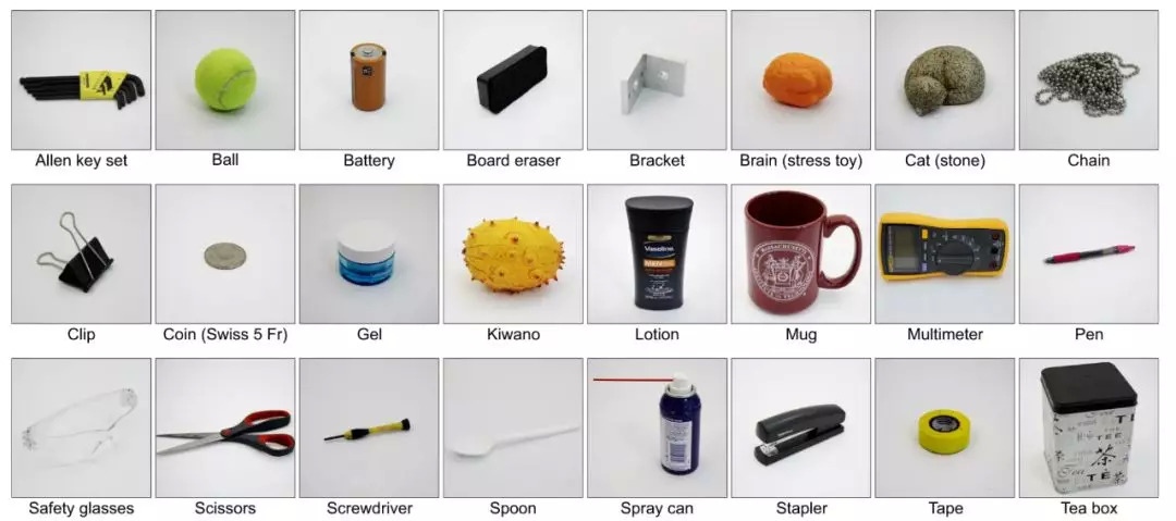 用于实验的物品。实验总共使用了 26 个物品;这里显示了 24 个,此外还有两个可乐罐(一个空罐和一个满罐)。