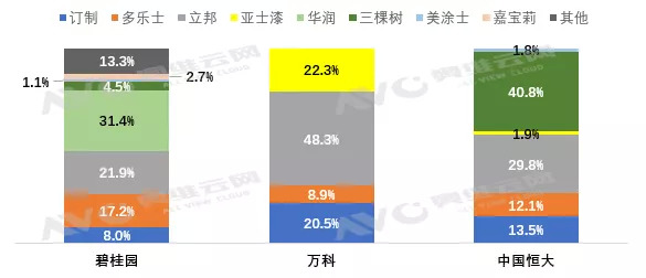 2019’Q1精装修乳胶漆市场规模来看,碧桂园占比13.4%,万科占比7.5%,中国恒大占比7.2%,为最重要的三大开发商。碧桂园合作的主要品牌为华润(31.4%)和立邦(21.9%);万科合作的主要品牌为立邦(48.3%)和亚士漆(22.3%);中国恒大合作的主要品牌为三棵树(40.8%)和立邦(29.8%)。从合作品牌结构来看,碧桂园和中国恒大的乳胶漆品牌合作较为分散,与多乐士、三棵树、嘉宝莉、美涂士等品牌均有合作;万科乳胶漆品牌合作则较为集中,主要是立邦、亚士漆和多乐士。