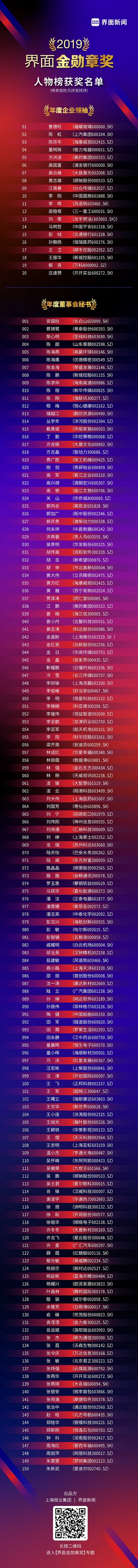 历经近5个月千锤百炼,并综合数据因子表现、全网投票排名、评委专家意见后,2019【界面金勋章奖】最终出炉资本市场8项年度大奖。20家“年度价值企业”、20家“年度董事会”获奖企业、20家“年度投资者关系”获奖企业、7家“年度资本创新”获奖企业、10家“年度新锐上市企业”、10家“年度金融机构”斩获年度企业大奖;20位“年度企业领袖”、150位“年度董事会秘书”则荣登金勋章年度人物榜。