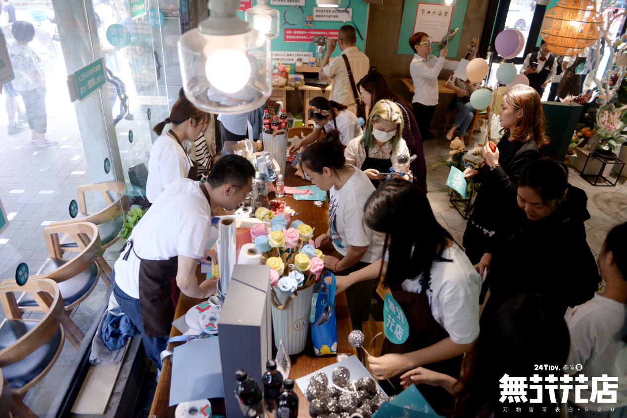 无花花店,一家没有鲜花的花店。花店共上下两层,日常不起眼的物品,例如果蔬面包、厨房用品、办公文具等,都被泰笛的巧手创意花艺师们连夜制作成了“花束”、“花盒”、“花桶”。这些手工包扎的花束,一经上架就被进店的客人们直接付款带走。花店一层还精心开辟了一个互动体验区,让消费者可以亲自动手制作“别样花束”,将这份真心直接送给爱的人。