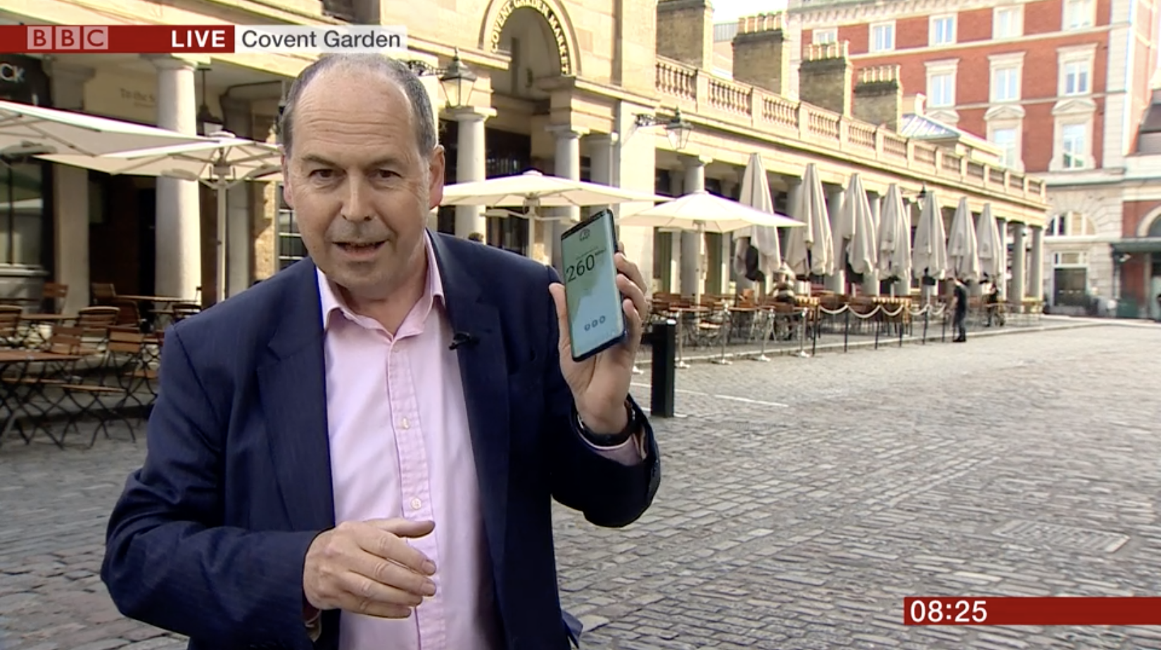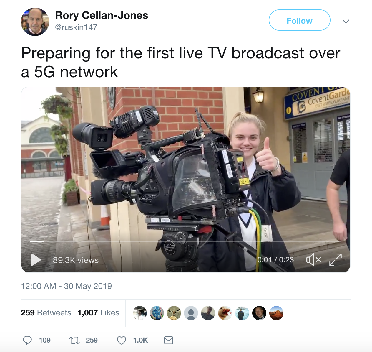 在BBC当天早上使用5G网络直播早间节目前,61岁的BBC记者罗里·赛伦-琼斯在个人社交媒体上展示了直播前的准备工作,他特意将镜头对准了华为的设备,解释说,“就是它,能够支持我们进行英国首次5G电视直播!”
