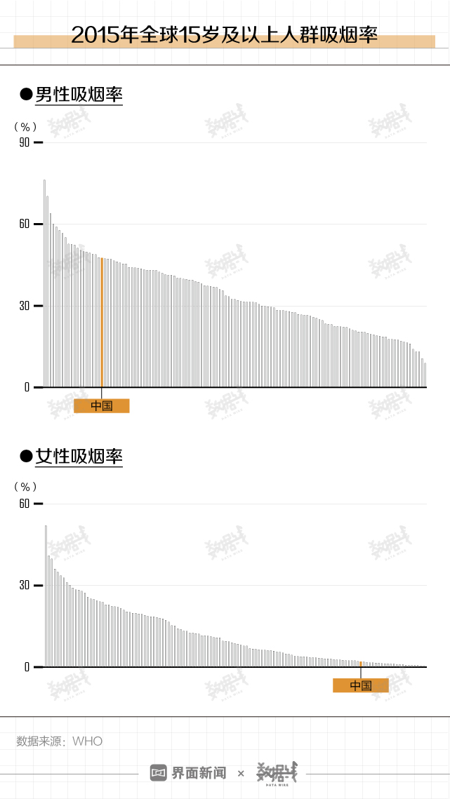与全球其他国家相比,中国男女在吸烟这件事上差异也很“悬殊”。根据世界卫生组织(下称WHO)2015年数据,中国15岁及以上男性吸烟率在127个国家和地区中排第20,15岁及以上女性吸烟率排名第106。