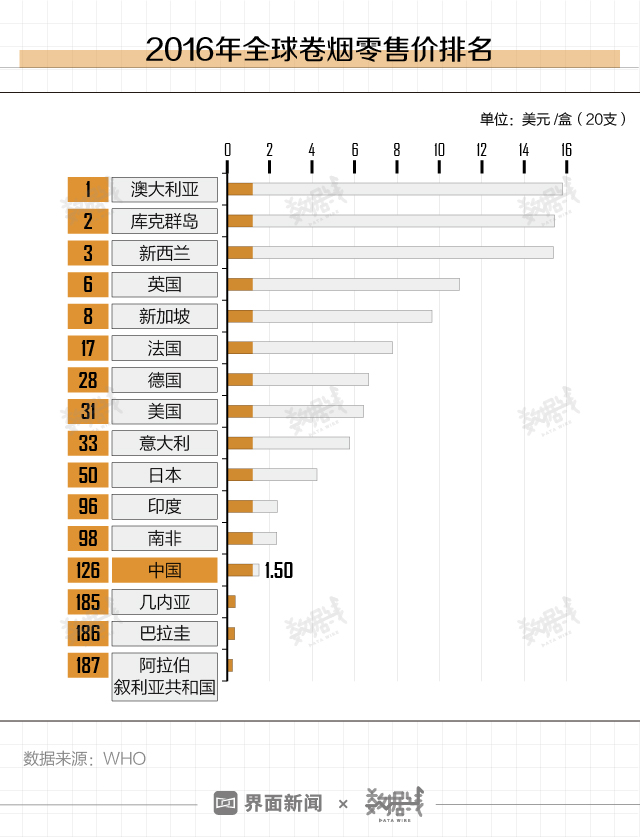 相对便宜的卷烟价格,对中国烟民充满着“吸引力”。2016年中国卷烟零售价格为1.5美元/盒(20支),在WHO录得数据的187个国家和地区中排名第126位。