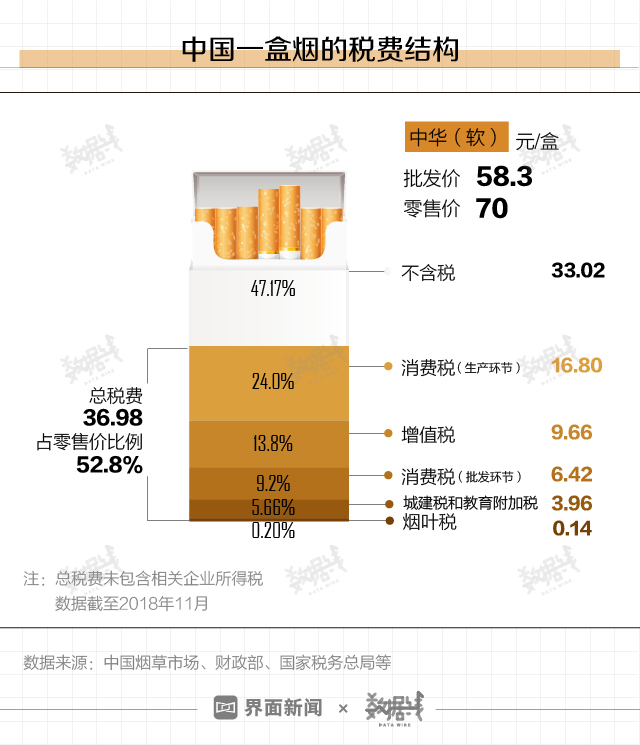 2015年5月,中国对卷烟消费税进行了第四次调整,将卷烟批发环节从税价税率由5%提高至11%,并按0.005元/支加征从量税。以中华(软)为例,中国烟草市场网显示其批发价为58.3元/盒,零售价为70元/盒,一盒中华(软)中的总税费(不含相关企业所得税)约为36.98元,占零售价52.8%。