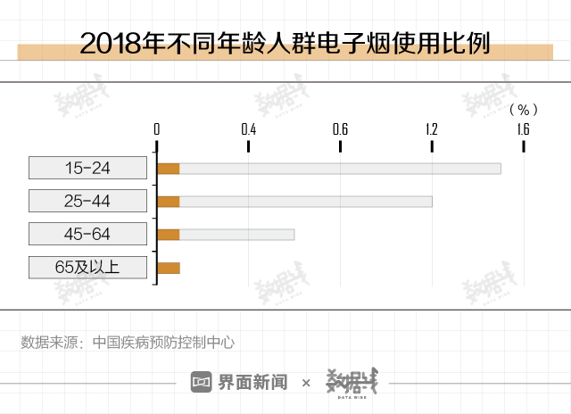 从年龄来看,年轻人已成为使用电子烟的主要人群。根据2018年中国成人烟草调查,15-24岁年龄组人群电子烟使用率为1.5%。