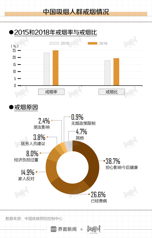 根据中国疾病预防控制中心发布的2018年中国成人烟草调查结果,2018年中国15岁及以上人群吸烟率为26.6%,其中男性为50.5%,女性为2.1%,与之前的调查结果相比呈下降趋势。