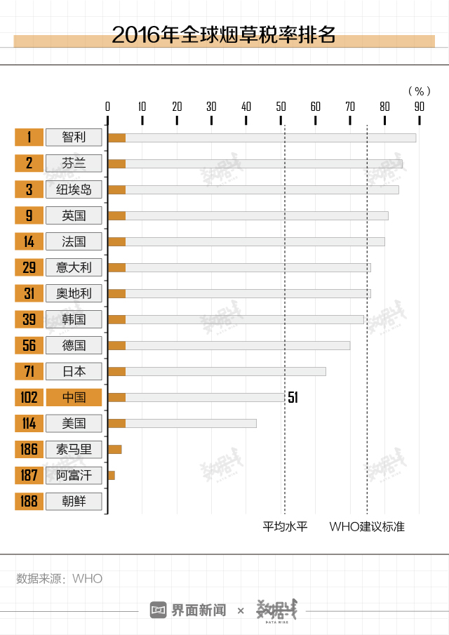 和零售价排名一样低的是烟草税率。根据WHO报告,2016年中国的烟草税率为51%,在全部的188个国家和地区中排名第102位,与世界卫生组织建议的75%仍存在差距。
