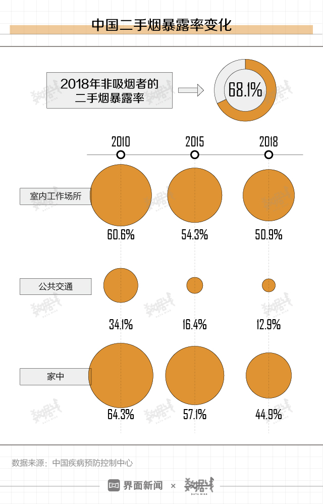 对于“被吸二手烟”的人群来说,二手烟暴露情况整体有所改善,2018年非吸烟者的二手烟暴露率为68.1%。50.9%的室内工作者在工作场所看到有人吸烟。44.9%的调查对象报告有人在自己家中吸烟。