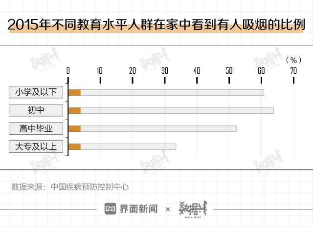 教育水平较低的人群,在家看到有人吸烟的比例较高。中国疾病预防控制中心数据显示,2015年,在教育水平仅初中毕业或更低的人群中,看到有人吸烟的比例均超60%。