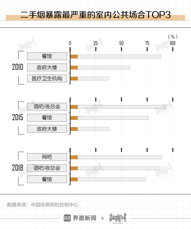 除了家里,哪最容易吸到二手烟?2010年是餐馆,2015年是酒吧/夜总会,2018年最容易吸到二手烟的公共场合是网吧。