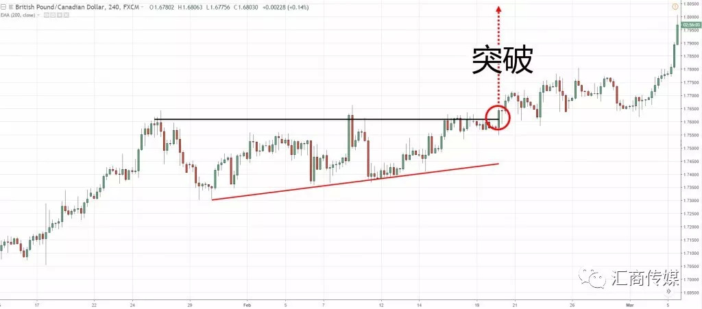 确定了这几点,你再考虑在哪里交易吧。我不清楚Ed Seykota关注哪种图表模式,但是我比较喜欢交易看涨图表模式。比如下图的上升三角形: