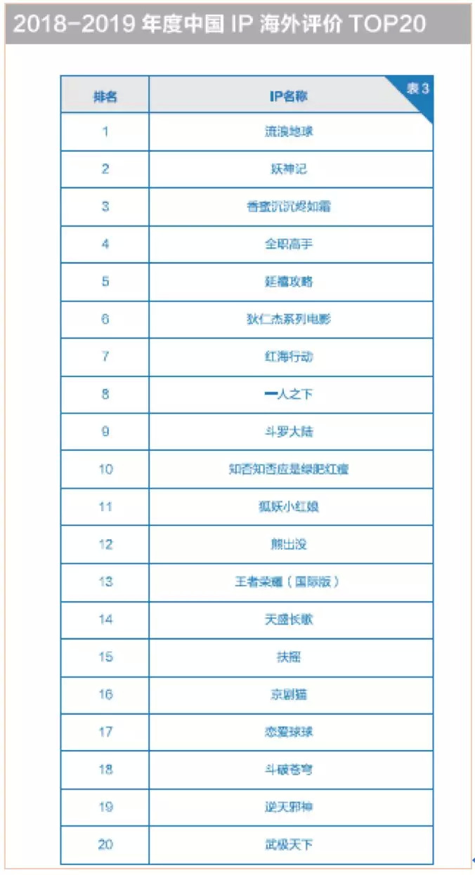 在《报告》所列出海中国IP中,中国传统内容仍占绝对优势,真正讲述当代中国故事的,只有《流浪地球》、《全职高手》和《红海行动》。但这三个当代IP,虽然占比低,排名却都很高。