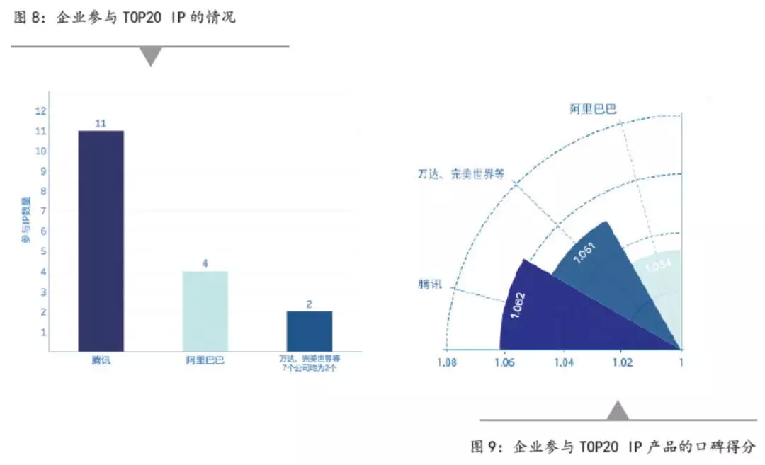 根据公开信息追溯企业参与《报告》中TOP20 IP的情况,腾讯集团参与出品的有11个,超过半数;阿里巴巴集团参与4个,完美世界、万达影业等多家企业各参与2个。