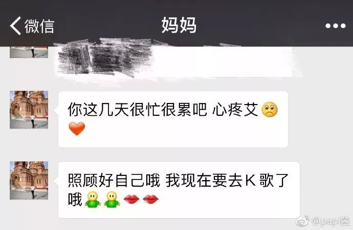 图片中,妈妈先是对女儿工作辛苦表示心疼,但紧接着就愉快的溜走去K歌了。