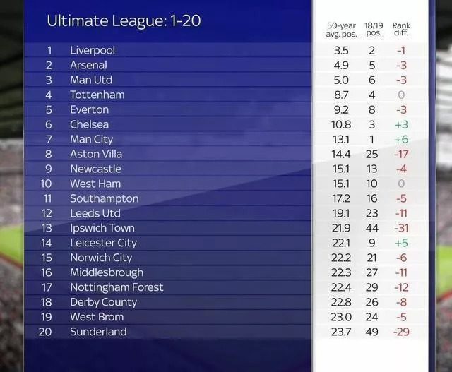 自从英超改制以来,利物浦拼尽全身力气但就是夺冠不能。《天空体育》统计了近50年英格兰球队在联赛中的平均排名,至今没有拿过英超冠军的利物浦却以平均3.5位排名第一,这足以见得红军“祖上很富裕”。
