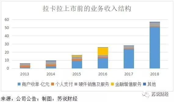 其次,拉卡拉业务结构陷入困局,为了上市自断退路。在移动支付逐渐占据支付的大片江山时,拉卡拉的个人支付业务却连连失守,收入比重快速下滑,从2013年的33%直接降至2018年的1.9%,还不如鸡肋的硬件销售收入(考拉等智能硬件)比重高。2014年拉卡拉开展互联网小贷业务,2015年贡献了1.46亿的收入,2016年贡献了9.16亿元的收入,稍弱于商户收单业务的12.69亿元。但因为要冲刺创业板,符合监管要求,将互联网小贷等业务剥离出去,直接导致拉卡拉失去了“双腿走路”的唯一机会。
