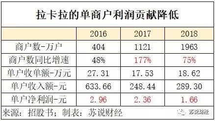 第三,为冲刺2018年IPO,自毁品牌只求收入。拉卡拉的业务结构困局导致了拉卡拉的成本居高不下。2016年,拉卡拉支付的商户拓展费约为4亿元;2018年,这一费用激增至27.8亿元,涨幅为696%;直接导致单个商户的收入贡献、净利润贡献大幅下滑。单户净利润从2016年的2.96元降至2018年的1.66元。这也是拉卡拉增收不增利的主要原因。