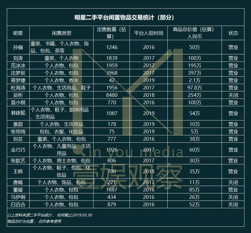明星入驻二手平台出售个人闲置物品,早已不是新鲜事。粗浅估算了一下,仅闲鱼一个平台入驻明星就多达55位,入驻其他二手交易平台的明星也在60位左右。