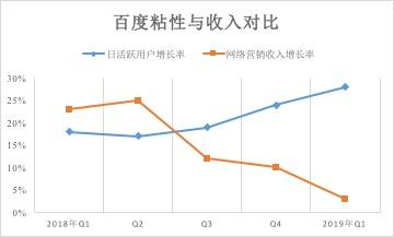 从财报来看,百度最近四个季度日活跃用户(DAU)同比增长率分别为:17%、19%、24%、28%,而对应的营收大头(占八成的网络营销收入)同比增长率分别为:25%、12%、10%、3%,DAU增长不断攀升,网络营销收入增长不断下跌。
