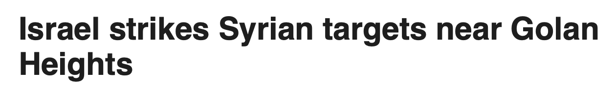 【以色列在戈兰高地附近空袭叙利亚目标】以色列军队称,在被占领的戈兰高地遭到火箭弹袭击后,以色列战机空袭了叙利亚军队目标。