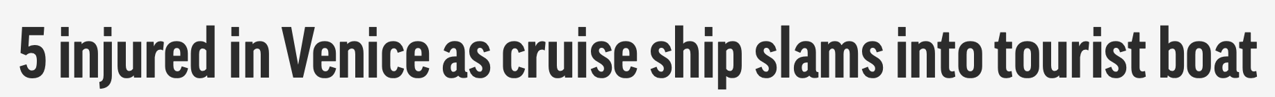 【巨型游轮撞上威尼斯码头和小型游船】一艘失控的巨型游轮周日早上在繁忙的威尼斯运河中撞上码头和一艘游船。意大利媒体报道,至少五人受伤。