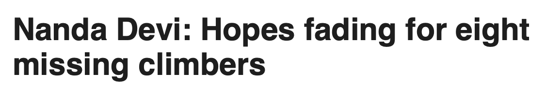 【找到喜马拉雅山八名失踪登山者的希望渺茫】印度搜救人员称,找到在喜马拉雅山失踪的八名登山者的希望渺茫。两架印度空军直升机在山区搜索,但官员们称,由于状况恶劣,不得不暂停搜索。