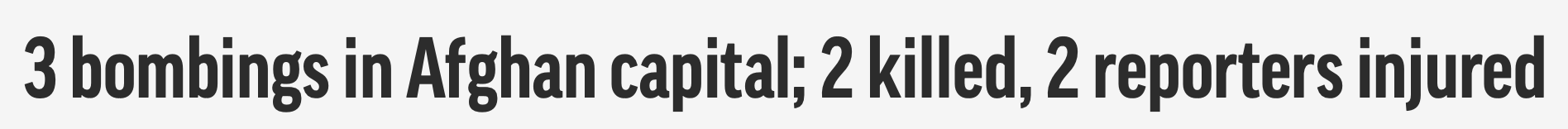【喀布尔发生三起炸弹爆炸,两人丧生】阿富汗官员称,首都喀布尔周日发生三起炸弹爆炸,至少两人丧生,24人受伤。据当地一个非政府媒体机构称,至少两名阿富汗记者在爆炸中受伤。