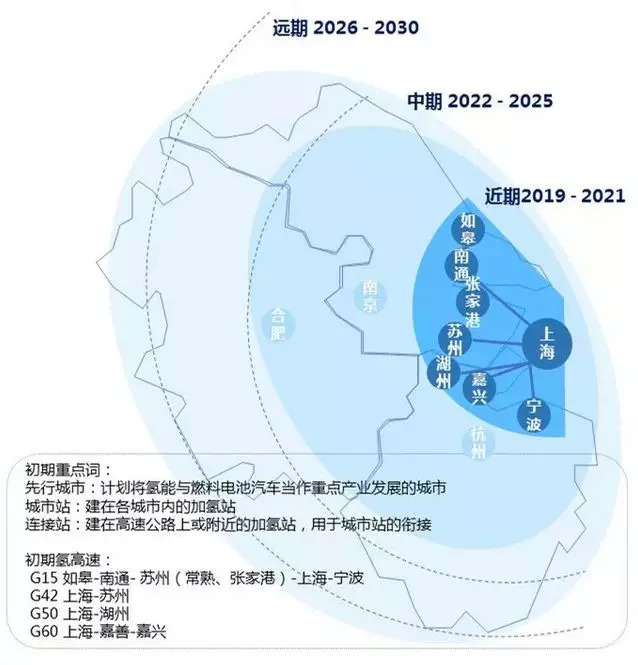 凭借着其先发优势,长三角计划分三个阶段在其周边形成一个区域性的氢能发展高地,共辐射近30个城市。
