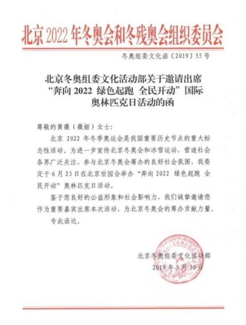 5月30日,北京冬奥组委文化活动部发函,邀请薇娅viya出席6月23日在北京世园会举办的“奔向2022 绿色起跑 全民开动”国际奥林匹克日活动。